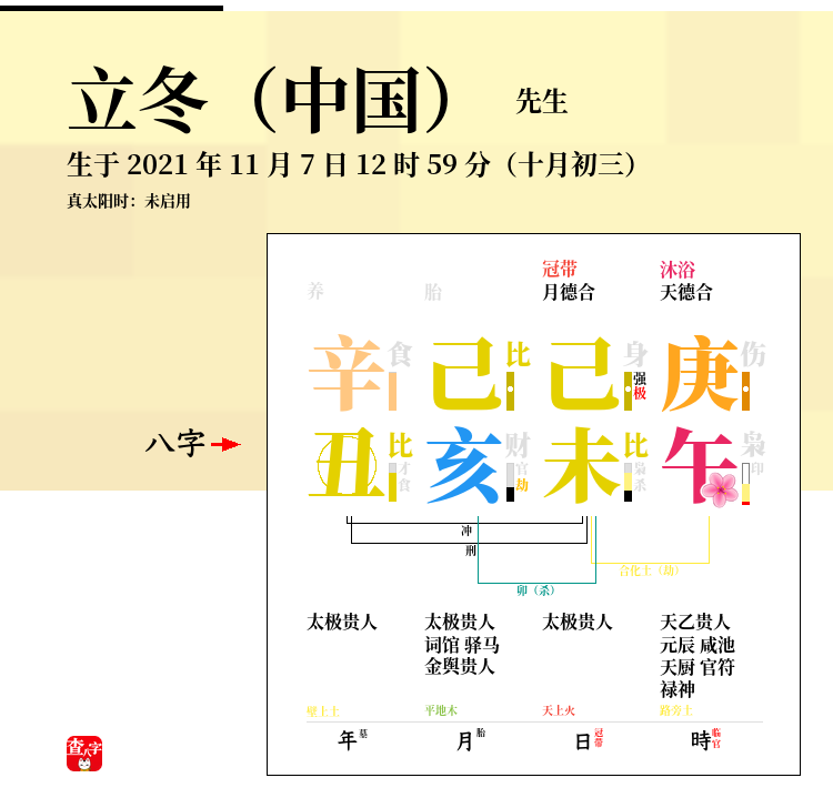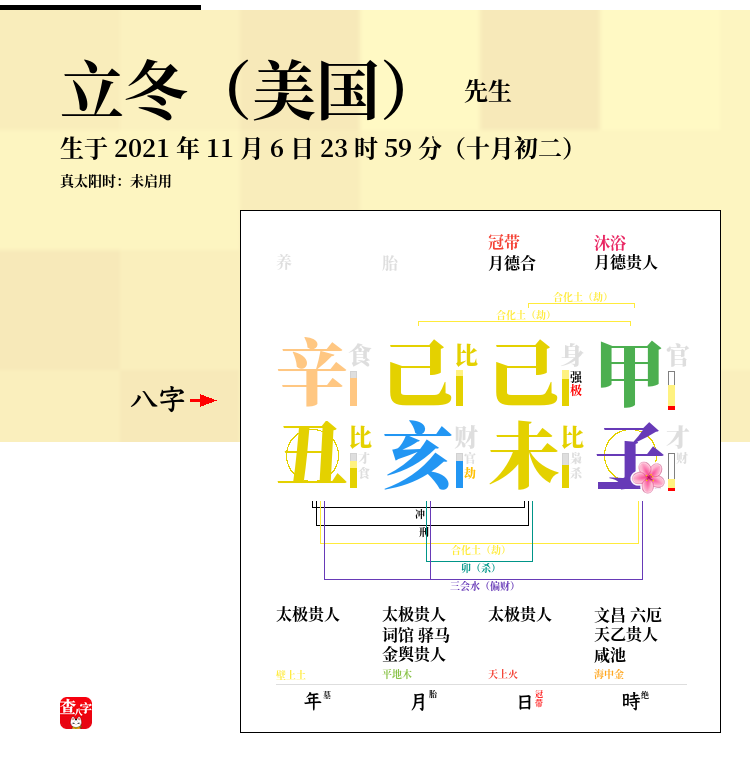 立冬,(华盛顿时间)发生于 2021 年 11 月 6 日 23 时。八字:辛丑 己亥 己未 甲子。