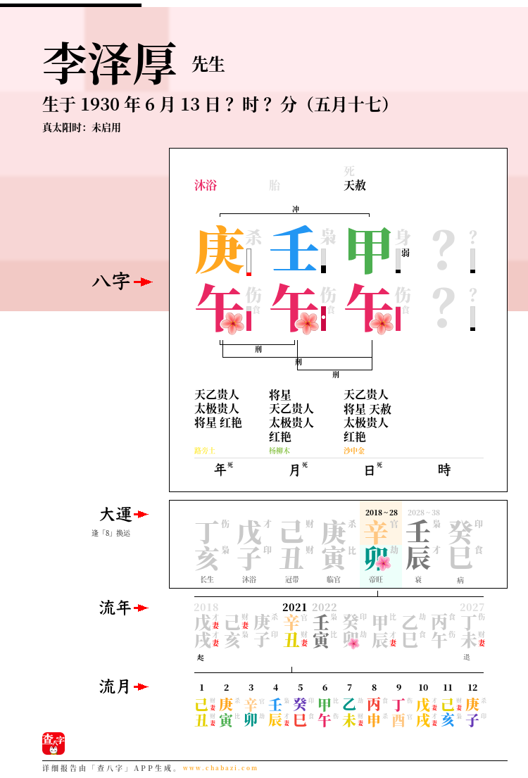 生于 1930 年 6 月 13 日。八字:庚午 壬午 甲午 ??。大运:辛卯(2018~2028)。